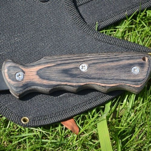 Full tang handle with screwed wooden hand scales.