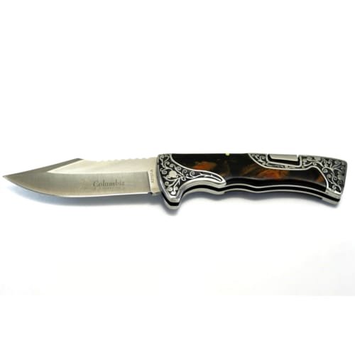 • Columbia A3157 lock-back folding knife with black-brown stone inlay handle